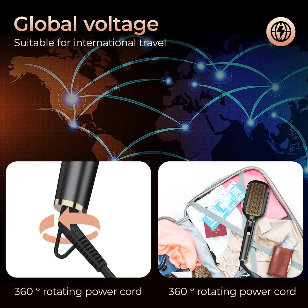 This hair straightener comb features dual voltage compatibility (100-240V) with automatic adjustment, (with adapter plug) allowing you to use it anywhere in the world without the need for manual switching. Perfect for global travel.