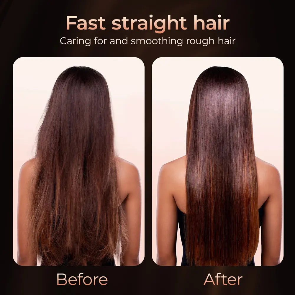 Negative ions seal cuticles → Eliminates 99% frizz | Hair-protecting formula: Reduces breakage vs. traditional straighteners