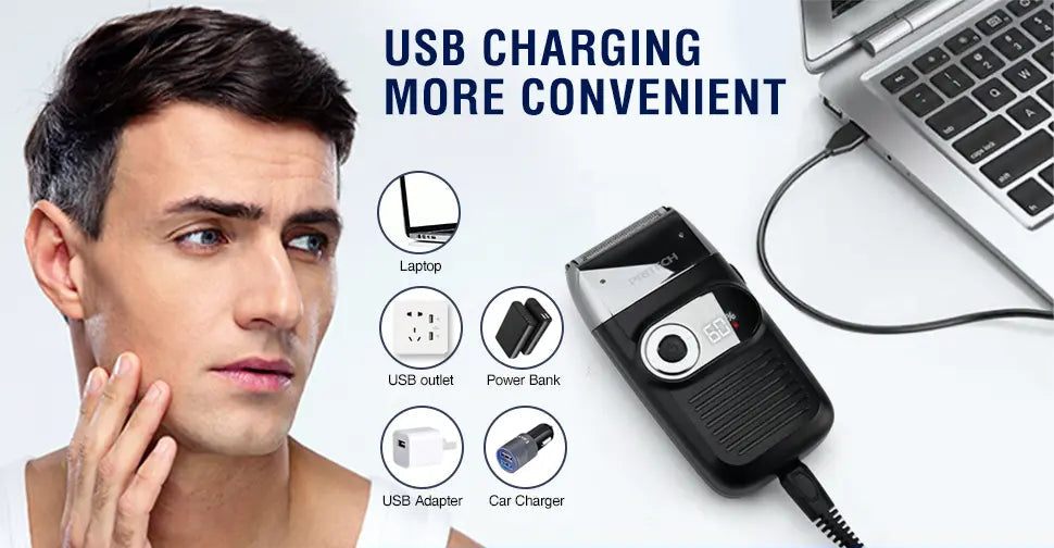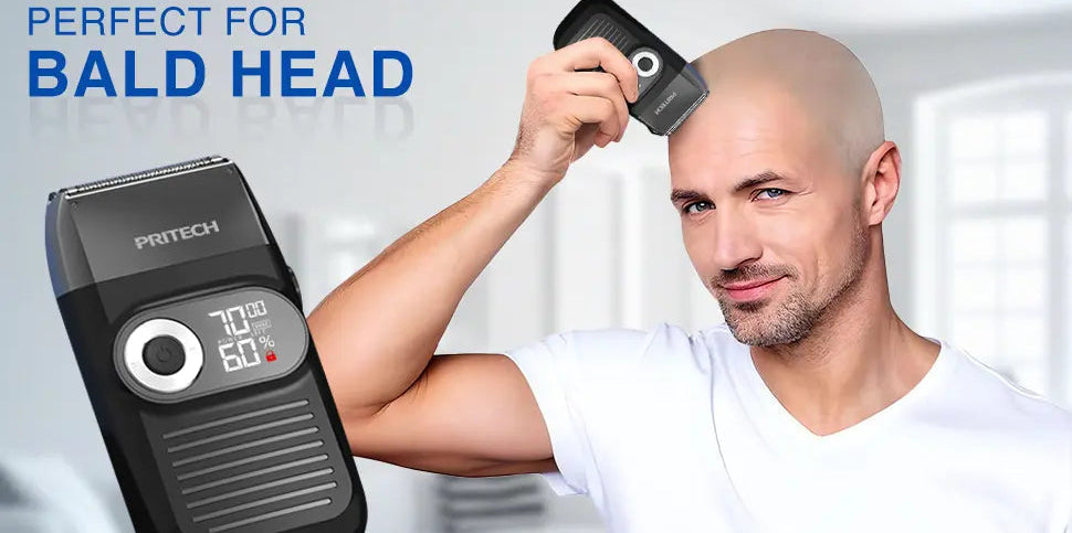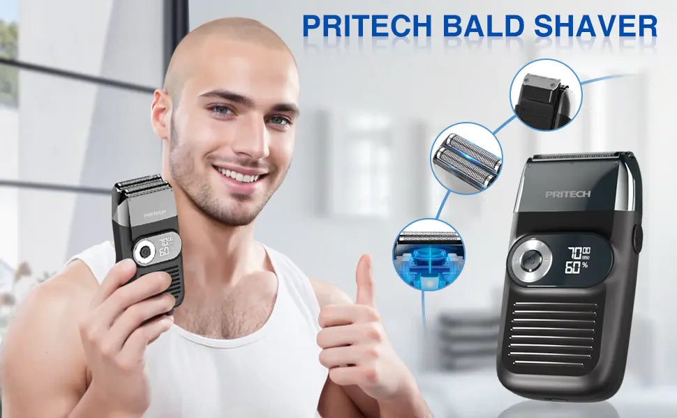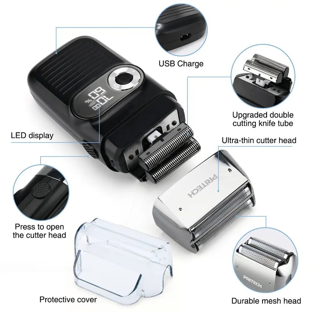 Pritech electric Foil and Bald shaver comes with beard trimmer and hair bald clipper.To meet your shaving needs, it can also meet your styling needs. First use a pop trimmer to shave the hair short, and then combine it with the use of a foil razor head for better results.