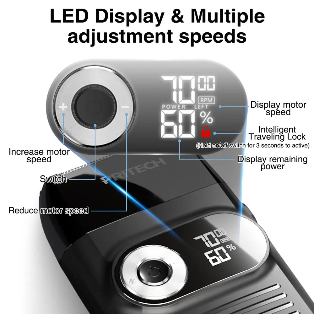 LED screen shows speed/battery. 3 adjustable speeds (6500–7500 RPM) for hair density. Travel lock (hold power 3s). -