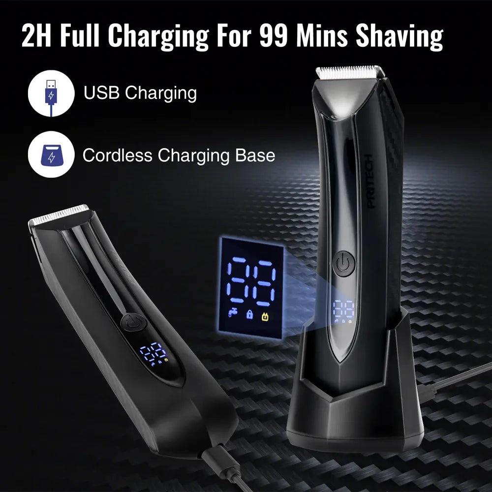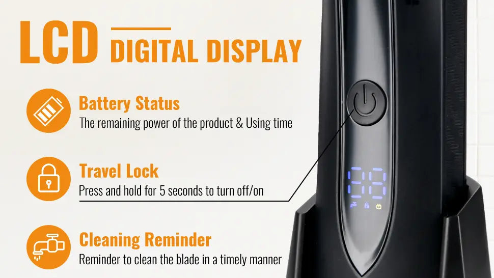 Guided Grooming Experience | LCD displays battery status & cleaning reminders | Built-in LED lights hard-to-see areas | Travel lock: Hold 5s to prevent accidental activation -